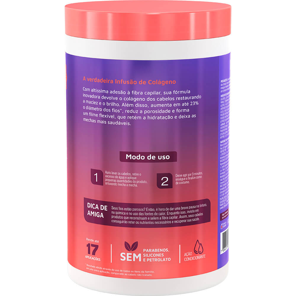 Hidratação, tratamento, nutrição e um aumento de até 23% no diâmetro dos fios e de até 80% no brilho. Resultado obtido através do uso de toda a família Infusão de Colágeno, em uma única aplicação, quando comparado ao cabelo não tratado. Resultado em 3 minutos. Ação condicionante. Penetra no fio. PH 3,4. Produto vegano. Não testado em animais. Fórmula liberada sem sulfato, parabenos, silicone e petrolatos.