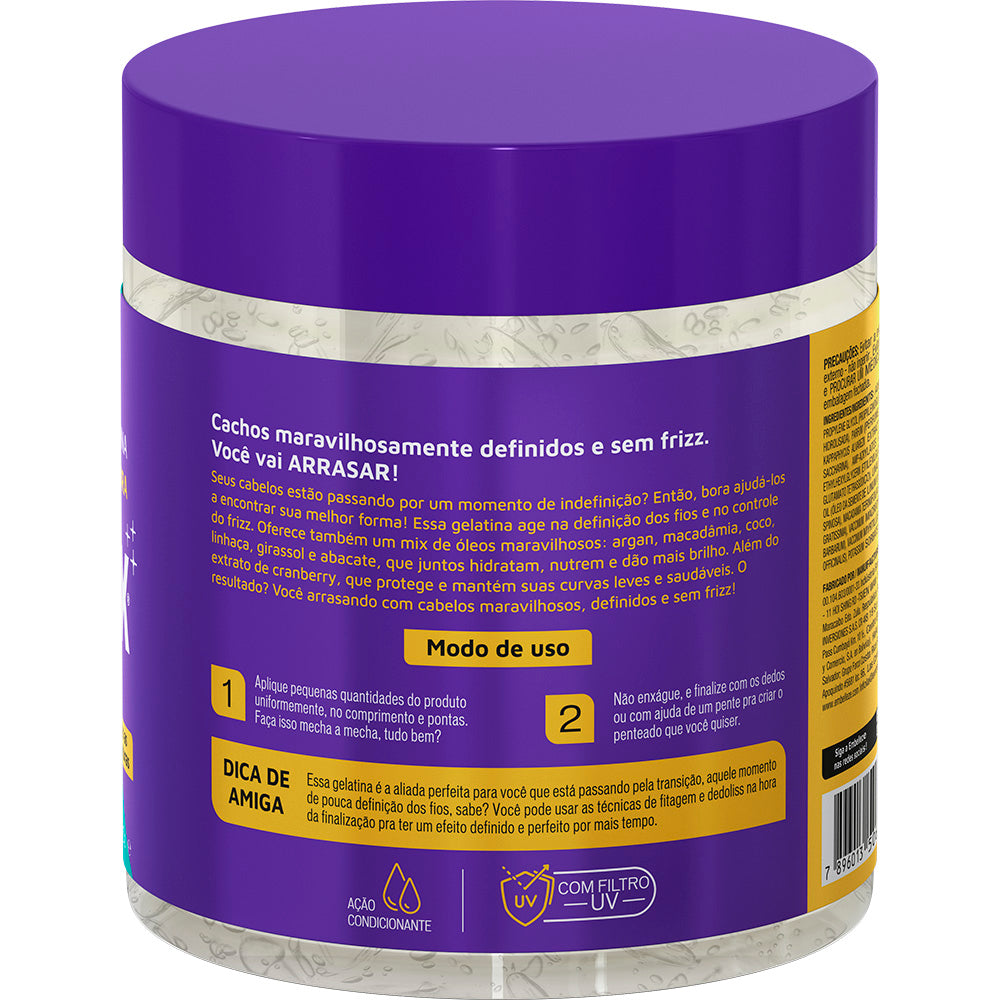 Cachos maravilhosamente definidos e sem frizz. Você vai ARRASAR! Seus cabelos estão passando por um momento de indefinição? Então, bora ajudá-los a encontrar sua melhor forma! Essa gelatina age na definição dos fios e no controle do frizz. Oferece também um mix de óleos maravilhosos: argan, macadâmia, coco, linhaça, girassol e abacate, que juntos hidratam, nutrem e dão mais brilho. Além do extrato de cranberry, que protege e mantém suas curvas leves e saudáveis. O resultado? Você arrasando com cabelos maravilhosos, definidos e sem frizz!