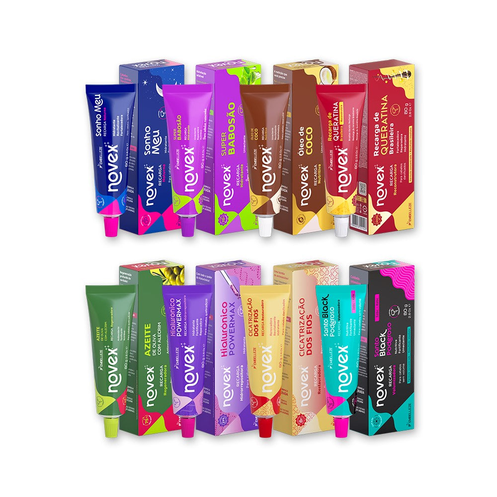 Máscara de Hidratação Novex Recarga Infusão de Colágeno 80g: Hidrata profundamente, regenera os fios, dá brilho intenso e oferece proteção térmica aos cabelos. Máscara de Hidratação Novex Cicatrização dos Fios Recarga de Aminoácidos 80g: Restauração profunda; Nutrição intensa; Mega-Hidratação. Máscara de Hidratação Novex Recarga Super Babosão 80g: Hidrata profundamente, umecta, repara, dá maciez, brilho e oferece proteção térmica aos cabelos. Máscara de Hidratação Novex Sonho Meu Recarga Noturna 80g: Uma Hidratação dos sonhos para os seus cabelos. Máscara de Hidratação Novex Recarga de Óleos Santo Black Poderoso 80g: Trata e hidrata profundamente com cabelos, dá brilho, elimina pontas-duplas e frizz. Tratamento reconstrutor Novex recarga de queratina: Age penetrando profundamente e garantindo uma rápida absorção pelos fios, fortalecendo sua estrutura e revitalizando-os poderosamente. Máscara de Hidratação Novex Hialurônico PowerMax Recarga Reparadora Harmonização Capilar 80G: Força, reconstrução e brilho; Age de dentro para fora. Máscara de Hidratação Novex Recarga Nutritiva Óleo de Coco 80G: Umectante, Revitalizante e Realinhadora. Máscara de Hidratação Novex Recarga Regeneradora Azeite de Oliva e Alecrim 80G: Regeneração profunda de verdade!