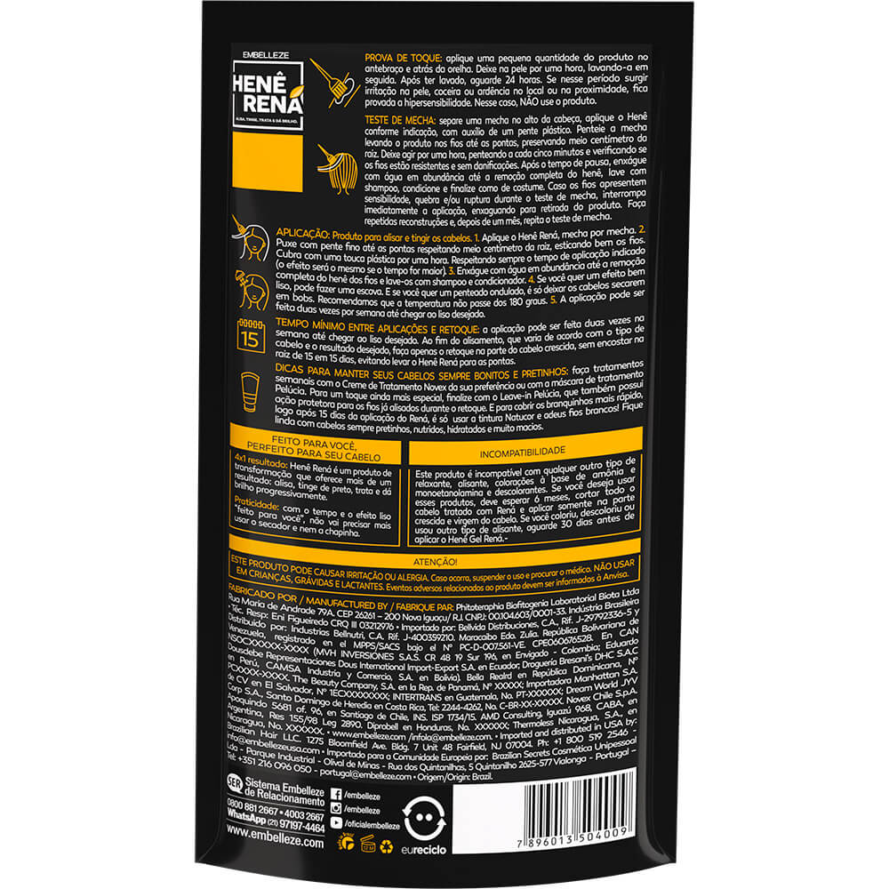 O Henê Rená Preto Natural é indicado para quem busca alisar os fios de forma progressiva, com uma cor preta intensa e natural. Não deve ser utilizado em conjunto com outros produtos, como relaxantes, alisantes ou colorações com amônia. Caso tenha usado esses tratamentos, aguarde pelo menos 6 meses, corte o cabelo tratado com Henê e aplique o produto apenas na parte virgem e crescida. IMPORTANTE: Este produto é incompatível com qualquer outro tipo de relaxante, alisante, colorações à base de amônia e descolorantes. Se você deseja usar estes produtos, deve esperar 6 meses, cortar todo cabelo tratado com Henê e aplicar somente na parte crescida e virgem do cabelo. Se desejar cobrir cabelos brancos, recomendamos nossa coloração Natucor, livre de água oxigenada e amônia. Se você coloriu, descoloriu ou usou outro tipo de alisante, aguarde 30 dias antes de aplicar o Henê. Não é recomendado para gestante. Antes de usar, faça a Prova de Toque. Aplique uma pequena quantidade do produto no antebraço e atrás da orelha. Deixe na pele por 60 minutos, lavando-a em seguida. Após ter lavado, aguarde 24 horas. Se nesse período surgir irritação na pele, coceira ou ardência no local ou na proximidade, fica provada a hipersensibilidade. Nesse caso, NÃO use o produto.