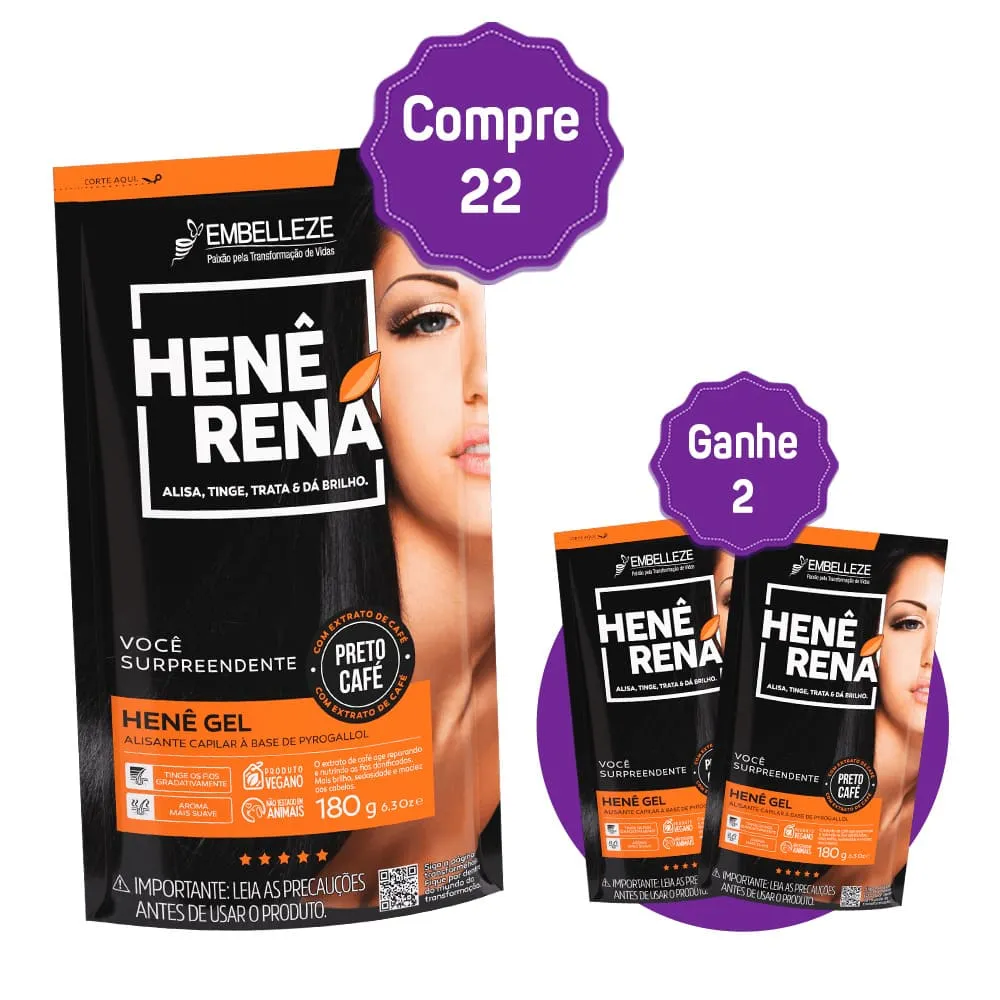om o Kit Compre 22 e Ganhe 2 Henê Rená Preto Café, você terá cabelos lisos por mais tempo, com cor intensa e brilho duradouro. O preto ganha reflexos modernos e sofisticados, enquanto os fios ficam leves, alinhados e sem frizz. Seja no dia a dia ou em ocasiões especiais, o Kit Henê Rená Preto Café com 24 unidades garante que seus cabelos estejam sempre impecáveis, com a força e a vitalidade do café que revitaliza cada fio.
