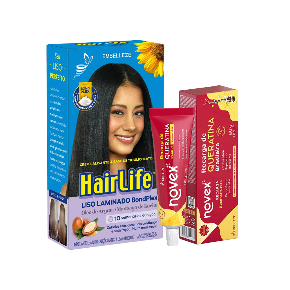 Esse kit contém 01- Creme Alisante HairLife Liso Laminado 01-Tratamento Reconstrutor Novex Recarga de Queratina Brasileira