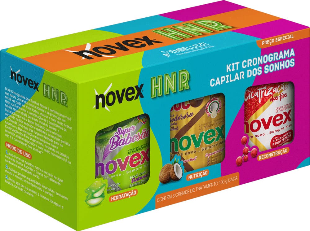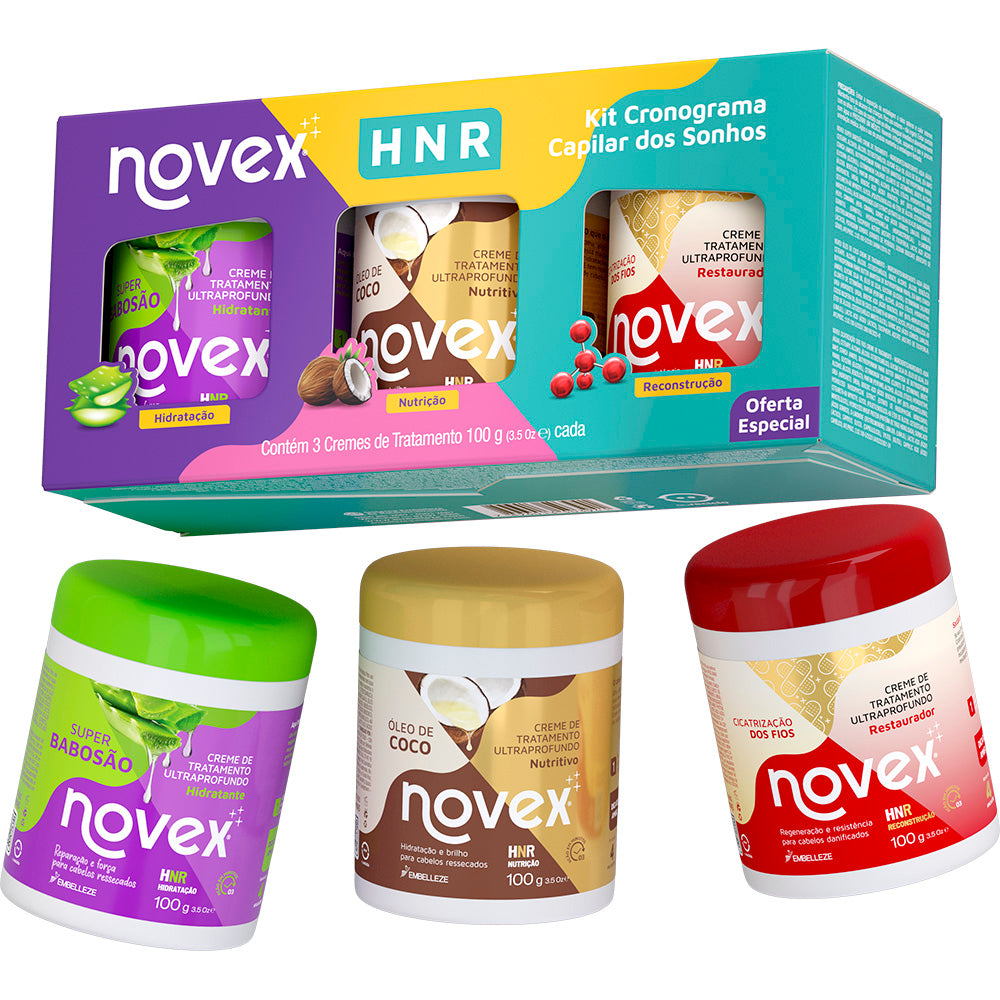 O Kit HNR Cronograma dos sonhos Novex é perfeito para você que adora cuidar dos seus cabelos e se preocupa em deixá-los cada vez mais fortes, macios e com muito brilho!