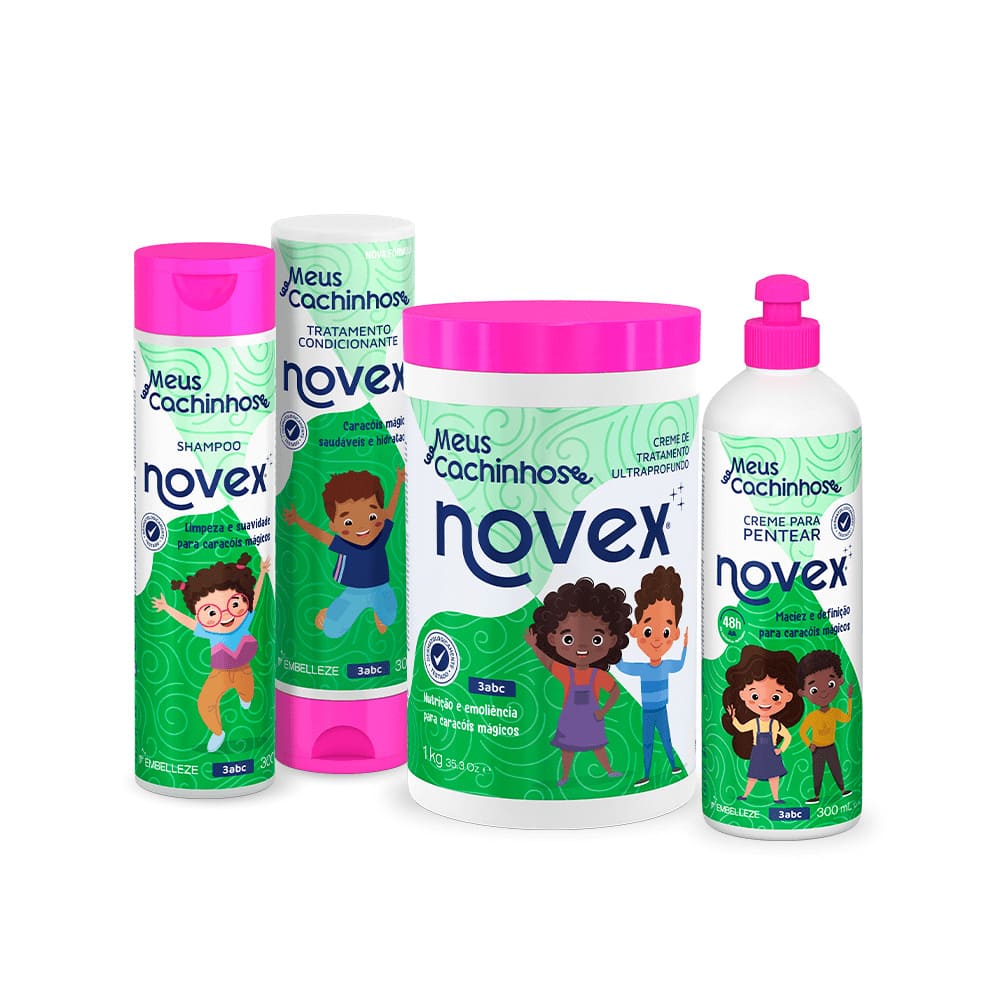 Shampoo Vitay Novex Meus Cachinhos 300ML Hidrata, dá brilho, maciez e define os cachinhos. Condicionador Novex Meus Cachinhos 300ML Condiciona, desembaraça e dá brilho aos cachos. Creme de Tratamento Novex Meus Cachinhos 1KG Trata e hidrata os cachinhos. Creme para Pentear Novex Meus Cachinhos 300ML Hidrata, nutre e dá maciez aos cachinhos.