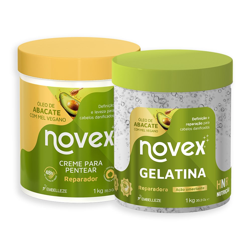 Cabelos definidos com danos reparados. Vida nova pra você. A gente sabe quando os cabelos estão fracos, danificados, pedindo ajuda. Nessa hora podemos contar com essa maravilha de gelatina, toda trabalhada no Óleo de Abacate, que define e repara os fios com a nutrição que precisamos pra dar aquela força. Além do Óleo de Abacate, que hidrata, nutre e repara os fios danificados, essa fórmula única oferece definição, controle do volume e do frizz. Seus cabelos ficam definidos, nutridos, revitalizados, com volume e frizz controlados. E você continua arrasando! Esse kit contém: 1- Gelatina Novex Óleo de Abacate com Mel Vegano Reparadora 1KG 1- Creme para Pentear Novex Óleo de Abacate e Mel Vegano 1KG