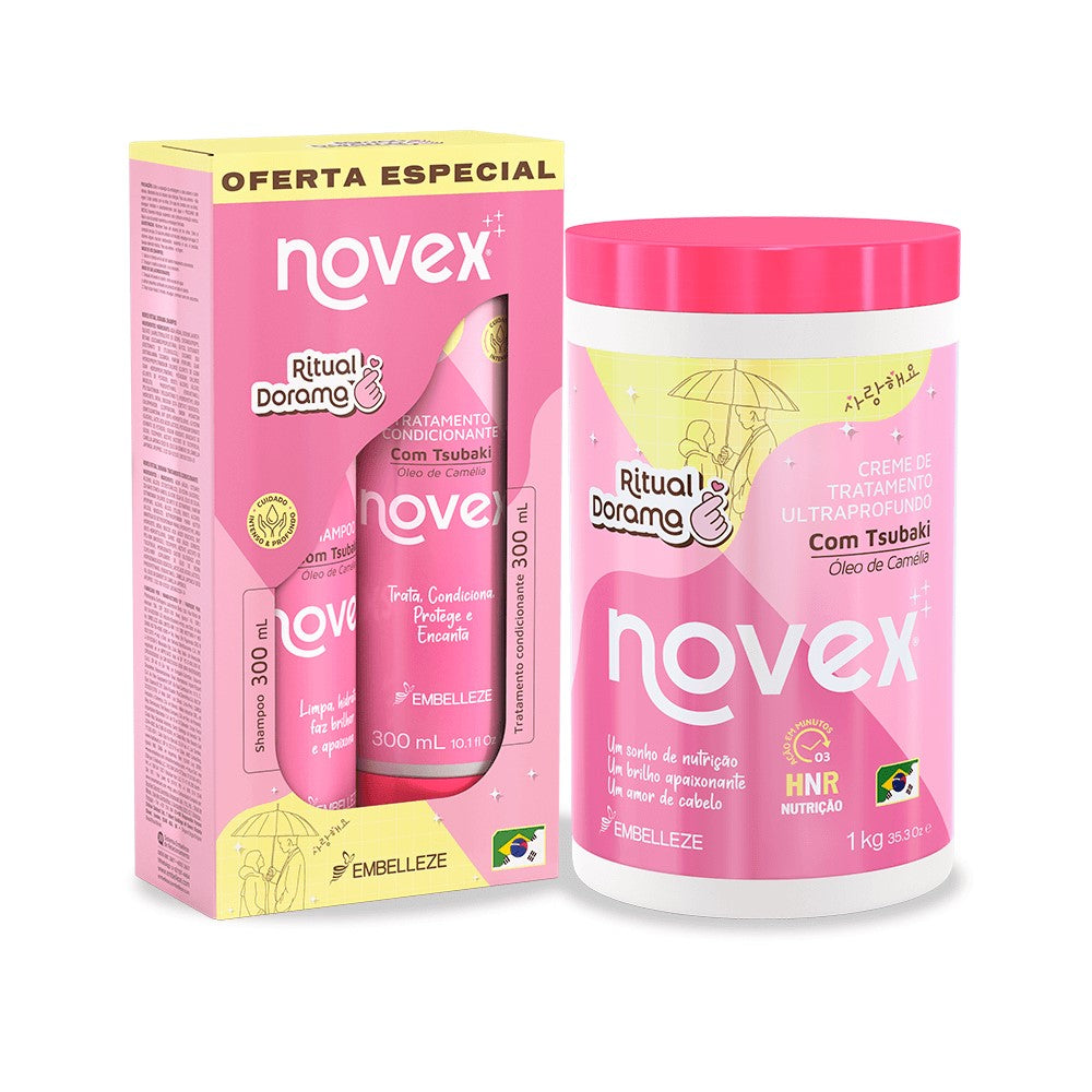 Shampoo Novex Ritual Dorama (300 ml): o shampoo limpa suavemente o couro cabeludo e os fios, preparando-os para os tratamentos subsequentes;