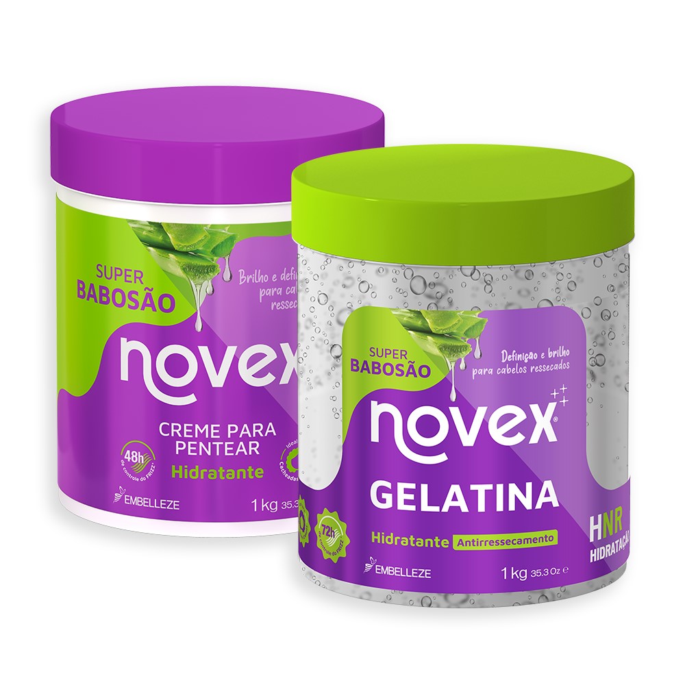Gelatina Novex Super Babosão Hidratante 1KG: AQUA (ÁGUA), GLYCERIN (GLICEROL), PPG-5-CETETH-20 (POLIPROPILENOGLI-COL-5-POLIETILENOGLICOL-20 ÉTER DE ÁLCOOL CETÍLICO), ACRYLATES/C10-30 ALKYL ACRYLATE CROSSPOLYMER (CROSPOLÍMERO DE ACRILATOS/ACRILATO DE ALQUILA C10-30), PROPYLENE GLYCOL (PROPILENOGLICOL), SODIUM HYDROXIDE (HIDRÓXIDO DE SÓDIO), BENZYL ALCOHOL (ÁLCOOL BENZÍLICO), PARFUM (PERFUME), HYDROXYETHYL UREA (HIDROXIETIL UREIA), PHENOXYETHANOL (FENOXIETANOL), TETRASODIUM EDTA (EDETATO DE SÓDIO), CHLORPHENESIN (CLORFENESINA), POLYURETHANE-14 (POLIURETANO-14), AMP-ACRYLATES COPOLYMER (COPOLÍMERO DE AMINOMETILPROPANOL-ACRILATOS), ETHYLHEXYL METHOXYCINNAMATE (OCTINOXATO), ALOE BARBADENSIS LEAF EXTRACT (EXTRATO DA FOLHA DE ALOE BARBADENSIS), HEXYL CINNAMAL (HEXIL CINAMAL), SORBITOL (SORBITOL), LINALOOL (LINALOL), PANTHENOL (PANTENOL), HYDROXYCITRONELLAL (HIDROXICITRONELAL), D-LIMONENE (DEXTROLIMONENO), ETHYLHEXYLGLYCERIN (ETILEXILGLICERINA), TETRASODIUM GLUTAMATE DIACETATE (DIACETATO GLUTAMATO TETRASSÓDICO), CITRONELLOL (CITRONELOL), POTASSIUM SORBATE (SORBATO DE POTÁSSIO), SODIUM BENZOATE (BENZOATO DE SÓDIO), AMINOMETHYL PROPANOL (AMINOMETILPROPANOL), BHT (BUTIL-HIDROXITOLUENO). Creme Para Pentear Novex Super Babosão 1KG: AQUA (ÁGUA), CETEARYL ALCOHOL (ÁLCOOL CETOESTEARÍLICO), ISOPROPYL PALMITATE (PALMITATO DE ISOPROPILA), PROPYLENE GLYCOL (PROPILENOGLICOL), GLYCERIN (GLICEROL), CAPRYLIC/CAPRIC TRIGLYCERIDE (TRIGLICERÍDEO CAPRÍLICO/CÁPRICO), GLYCINE SOJA OIL (ÓLEO DE SOJA), CETRIMONIUM CHLORIDE (CLORETO DE CETRIMÔNIO), BENZYL ALCOHOL (ÁLCOOL BENZÍLICO), CETYL ALCOHOL (ÁLCOOL CETÍLICO), BEHENTRIMONIUM METHOSULFATE (METOSSULFATO DE BEENTRIMÔNIO), PARFUM (PERFUME), ALCOHOL (ÁLCOOL ETÍLICO), BEHENTRIMONIUM CHLORIDE (CLORETO DE BEENTRIMÔNIO), HYDROXYETHYL UREA (HIDROXIETIL UREIA), ALOE BARBADENSIS LEAF EXTRACT (EXTRATO DA FOLHA DE ALOE BARBADENSIS), GUAR HYDROXYPROPYLTRIMONIUM CHLORIDE (CLORETO DE GOMA GUAR HIDROXIPROPILTRIMÔNIO), DISODIUM EDTA (EDETATO DISSÓDICO), ETHYLHEXYL METHOXYCINNAMATE (OCTINOXATO), SORBITOL (SORBITOL), POLYURETHANE-14 (POLIURETANO-14), BENZOIC ACID (ÁCIDO BENZOICO), ISOPROPYL ALCOHOL (ÁLCOOL ISOPROPÍLICO), BHT (BUTIL-HIDROXITOLUENO), AMP-ACRYLATES COPOLYMER (COPOLÍMERO DE AMINOMETILPROPANOL-ACRILATOS), HEXYL CINNAMAL (HEXIL CINAMAL), SORBIC ACID (ÁCIDO SÓRBICO), PEG-90M (MACROGOL), LINALOOL (LINALOL), HYDROXYCITRONELLAL (HIDROXICITRONELAL), PHENOXYETHANOL (FENOXIETANOL), D-LIMONENE (DEXTROLIMONENO), HELIANTHUS ANNUUS SEED OIL (ÓLEO DE GIRASSOL), ETHYLHEXYLGLYCERIN (ETILEXILGLICERINA), SODIUM BENZOATE (BENZOATO DE SÓDIO), POTASSIUM SORBATE (SORBATO DE POTÁSSIO), CITRONELLOL (CITRONELOL), LINUM USITATISSIMUM SEED OIL (ÓLEO DA SEMENTE DE LINUM USITATISSIMUM), COCOS NUCIFERA OIL (ÓLEO DE COCO), TETRASODIUM GLUTAMATE DIACETATE (DIACETATO GLUTAMATO TETRASSÓDICO), AMINOMETHYL PROPANOL (AMINOMETILPROPANOL), ARGANIA SPINOSA KERNEL OIL (ÓLEO DA SEMENTE DE ARGANIA SPINOSA), MACADAMIA TERNIFOLIA SEED OIL (ÓLEO DA SEMENTE DE MACADAMIA TERNIFOLIA), OLEA EUROPAEA FRUIT OIL (ÓLEO DE OLIVA), PERSEA GRATISSIMA OIL (ÓLEO DE PERSEA GRATISSIMA), ROSMARINUS OFFICINALIS LEAF EXTRACT (EXTRATO DA FOLHA DE ROSMARINUS OFFICINALIS).
