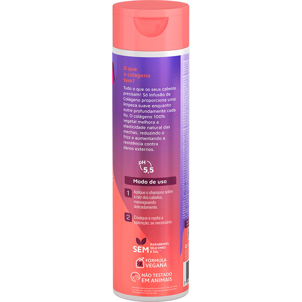 Hidratação, limpeza e um aumento de até 23% no diâmetro dos fios e de até 80% no brilho. Resultado obtido através do uso de toda a família Infusão de Colágeno, em uma única aplicação, quando comparado ao cabelo não tratado. Produto vegano. Não testado em animais. Fórmula liberada sem sulfato, parabenos, silicone e petrolatos.